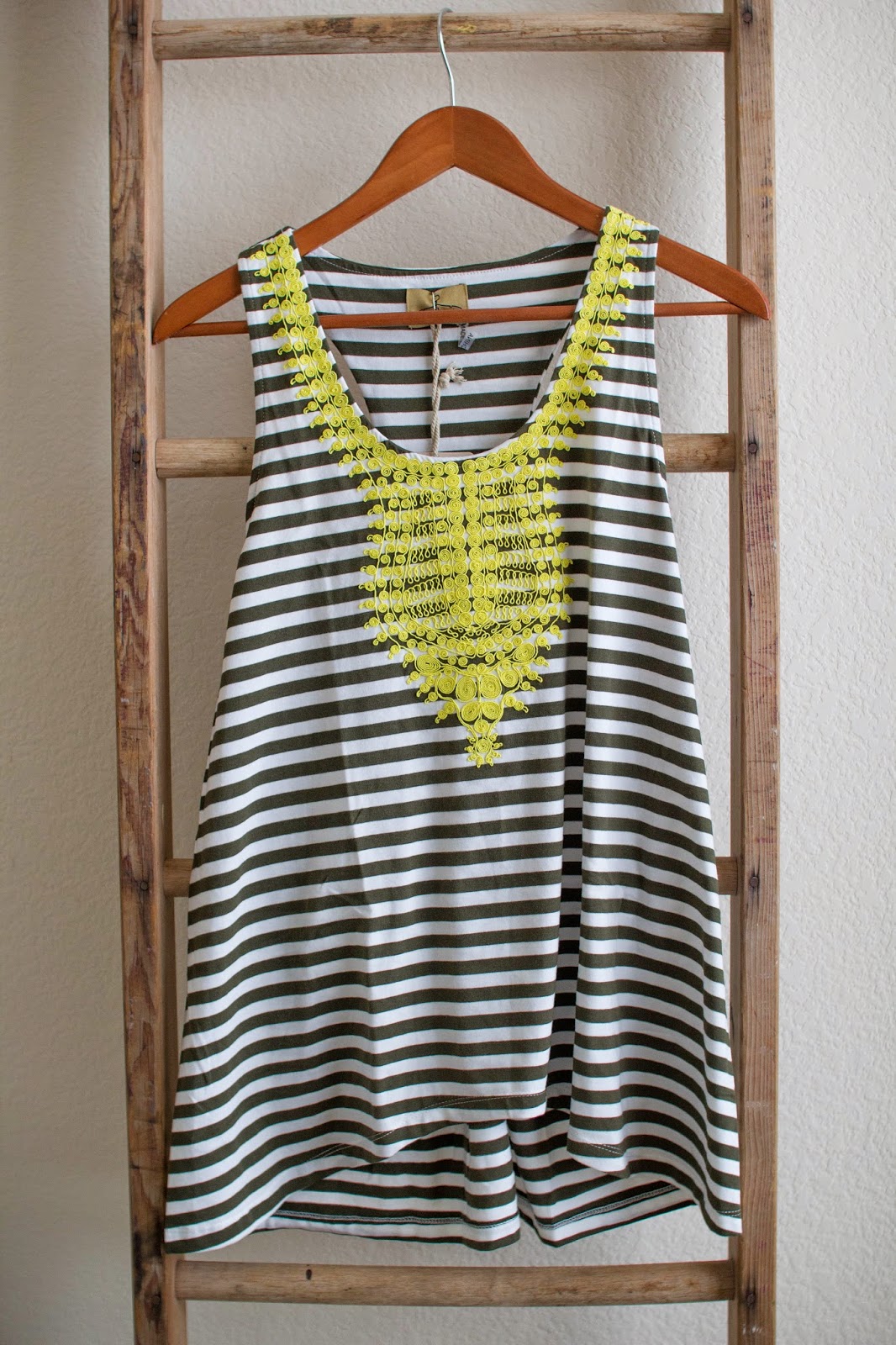 Since it was just me and Brinley at home I didn’t attempt to take pictures of me wearing the clothes so I just hung them up for you to see. The first item I tried on was my favorite and definite keeper. I had asked for cute summer clothes that could go from the playground to a lunch date and this top is perfect for that. The fabric as super comfortable and flattering. It is also a longer length top which I like.